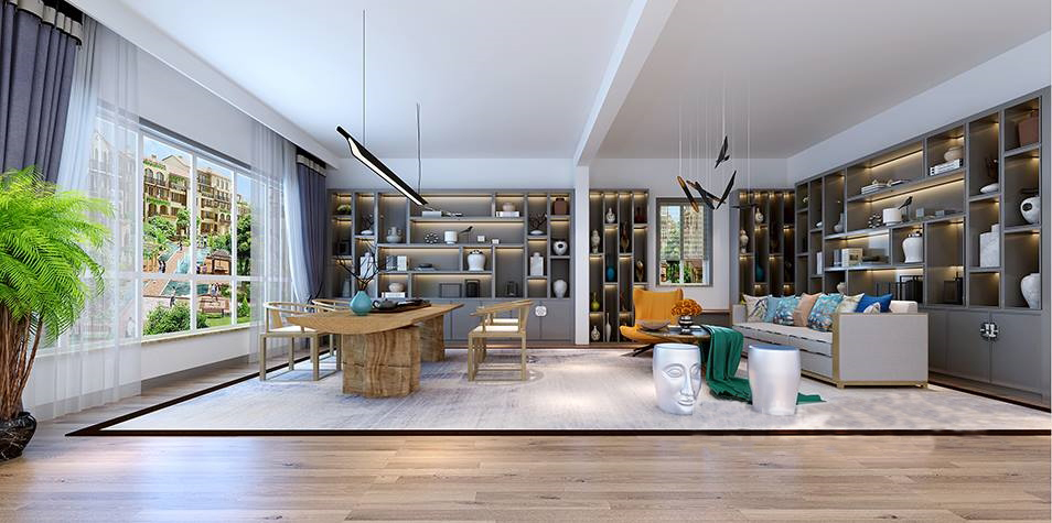 这里原本是一处挑空区域,搭建楼板后多出一块雅致的空间,物尽其用,设计师将其设计成书吧区域,开阔的视野、高大明亮窗子,给人一种豁达、放松的感官感受。