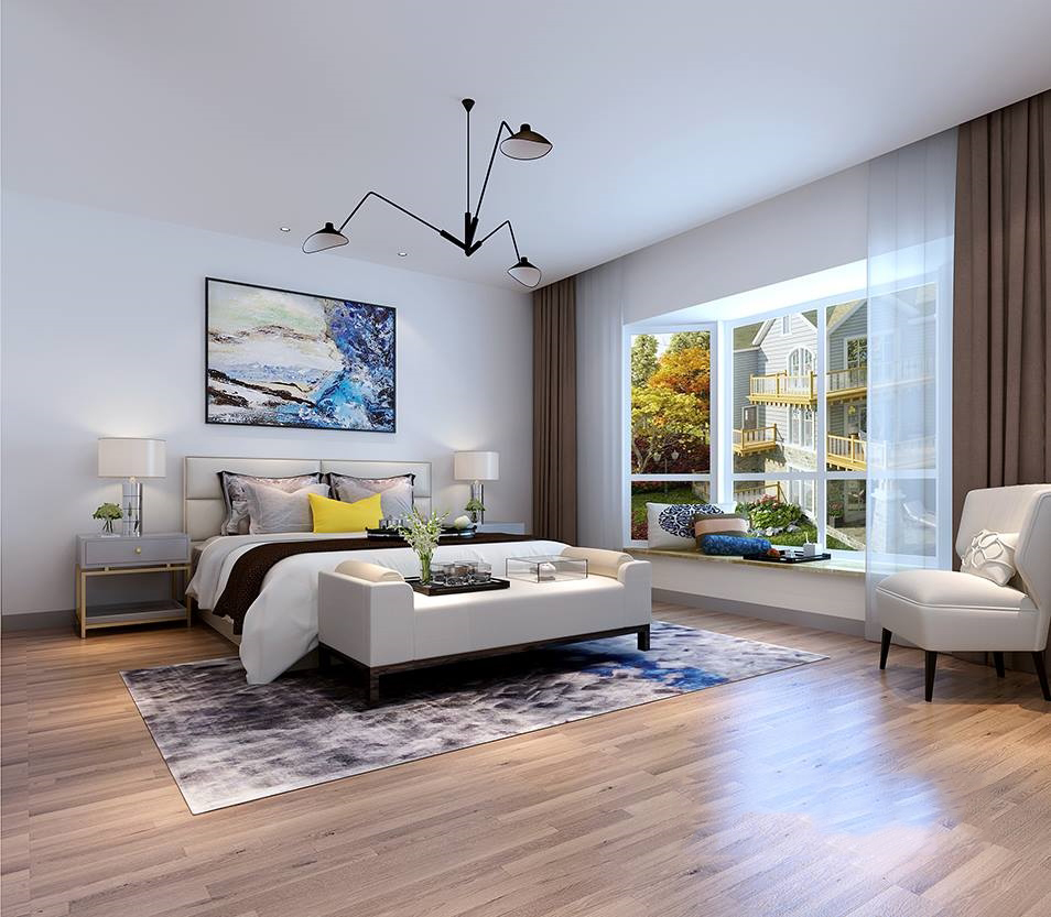 主卧室充分体现了其作为一个休息空间的功用,编织的方形地毯、金属装置感极强的吊灯、皮脂小座椅以及小巧的床头灯,不同的肌理和材质,打造出了一个温馨舒适的主卧室。