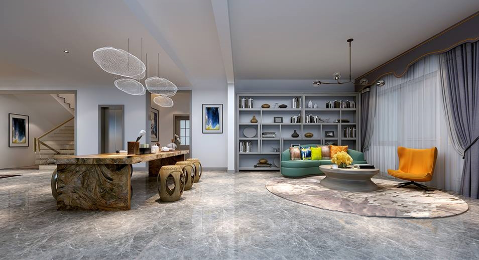 本案例设计师采用现代简约别墅装修设计风格从点、线、面勾勒轮廓,从纯粹处填补颜色,巧妙的光影结构令整个场域回荡出无声的冲击。