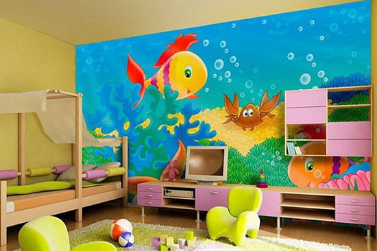 卡通画一直是小朋友的最爱,美丽的鱼儿,可爱的螃蟹,轻盈的水藻,整面墙的海底世界图让儿童房变身为海底的一部分.