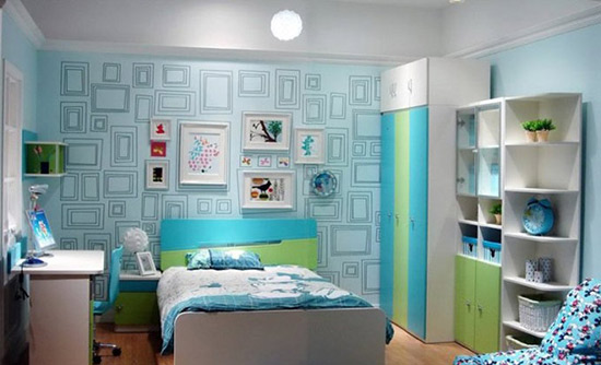 这是一款较为简单却功能齐全的儿童房,书桌,置物架,衣柜一应俱全.背景墙采用简单的方形线条组合,加以装饰画的点缀,勾勒出不一样的美丽背景墙.