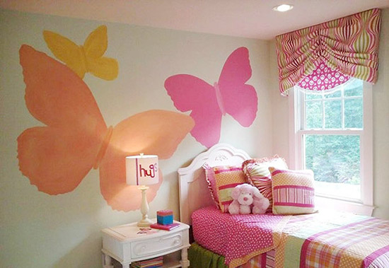 这款儿童房手绘墙的设计较为简单,几只跟房间软装色彩相搭的纯色蝴蝶,线条简单,完全可以自己手动绘制,方便实用.