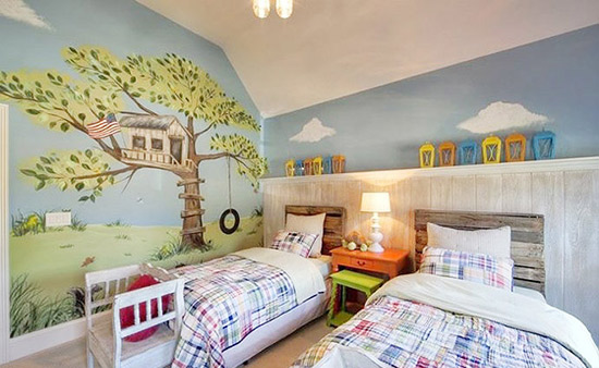 蓝天白云绿树的手绘墙儿童房,给孩子轻松自在的睡眠环境.美丽的卡通画也会让孩子更加喜欢自己的房间.