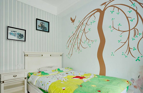 这款儿童房背景墙采用手绘+壁纸的形式,浅浅的色彩给人清新宜人的感受,生机勃勃的小树给孩子健康向上的力量.
