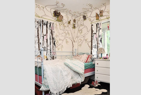 这棵小树绘在墙角,茂密的枝干向四周延伸开,甚至到了天花板.设计师在枝干上点缀了几只木匣子,让树一下子变得活灵活现起来.