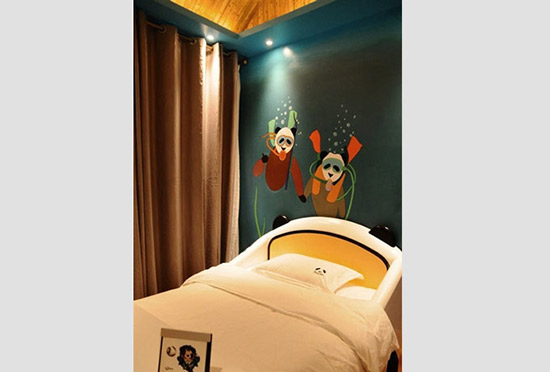 背景墙简单绘了两只潜水的熊猫,可爱十足,儿童床也是熊猫的形状,创意的同时也让整个卧室紧密的练习在一起.