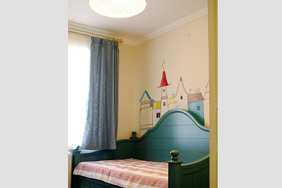同样的城堡手绘墙因为沙发床的设计而变得可爱起来,弧形的栏杆既是床的装饰,也点缀了画中的城堡,一举两得.