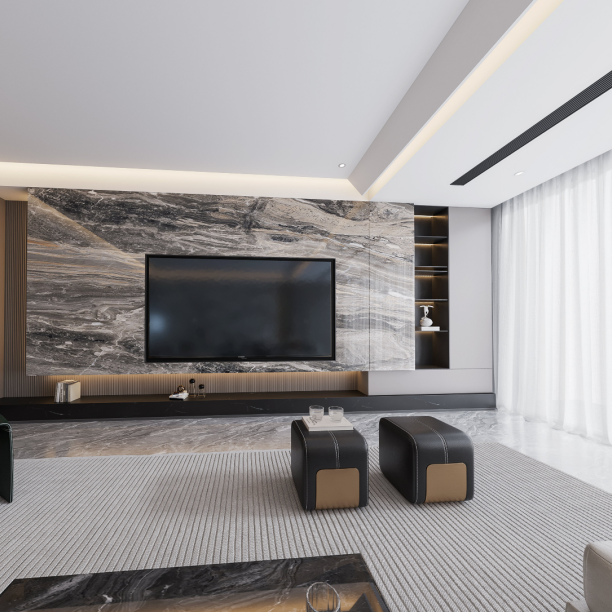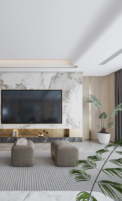 开放式的布局,使得空间通透而明亮,墙面与顶面造型简洁大气,电视背景墙则用整版大理石来提升空间质感。