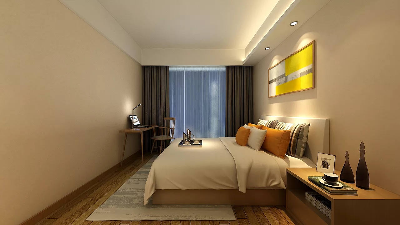 简单对称的背景墙装修设计,大气又舒适。大大的落地窗,阳光渗透进整个卧室,小巧精致的台灯,淡淡的浅黄色,为整个卧室空间营造出一个优雅高贵的环境。