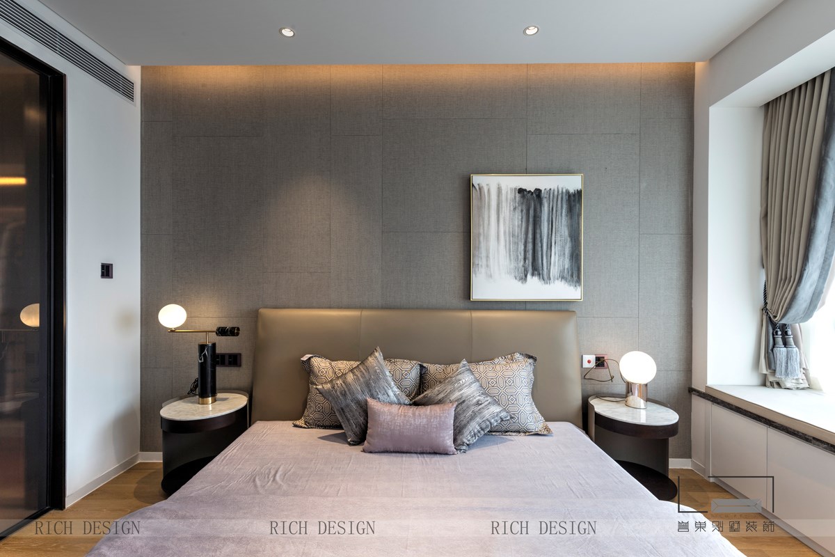 次卧主要运用了高级灰背景墙,配上一幅画,整个卧室呈现出一个很大气的景象