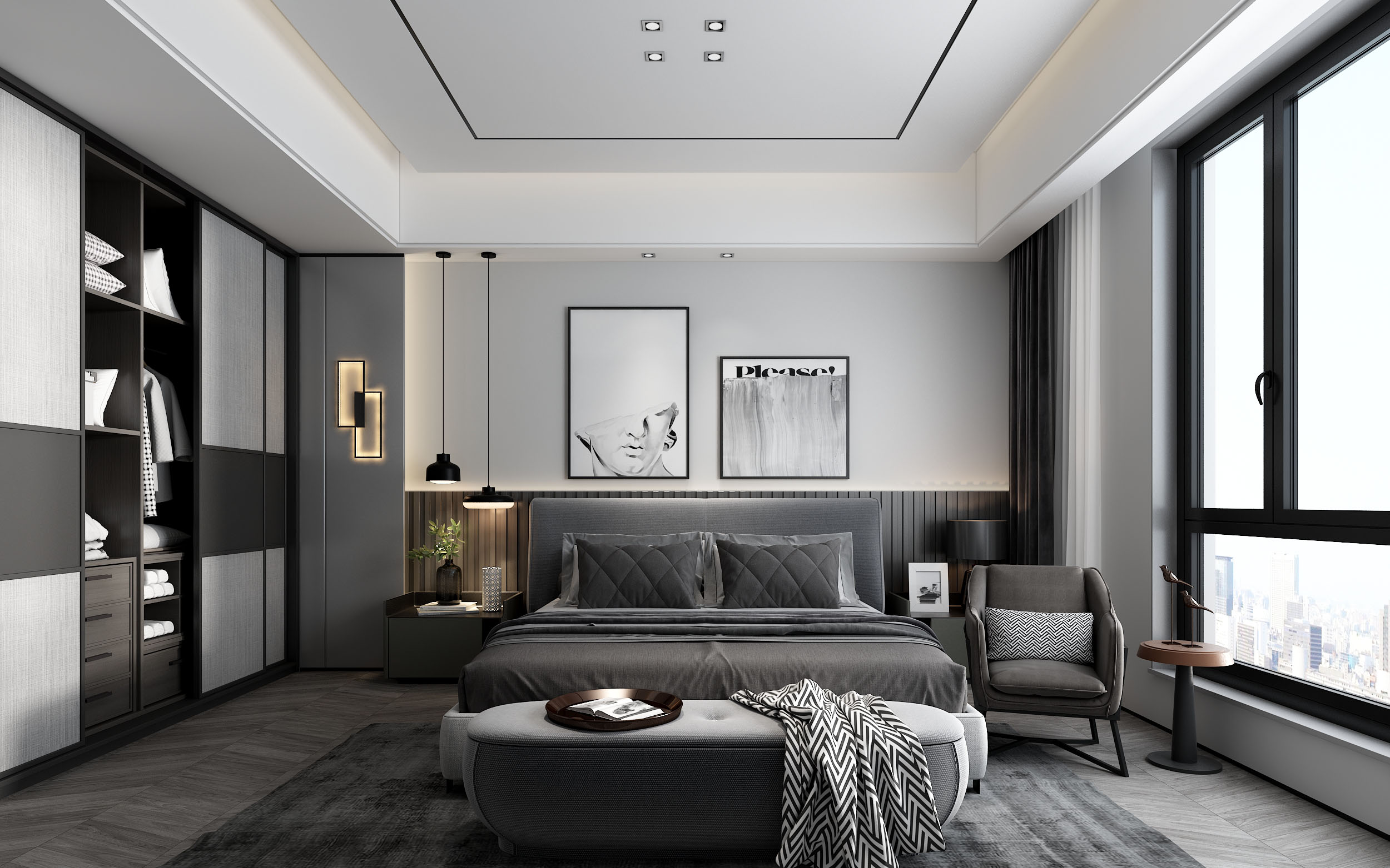 在卧室装饰设计中,空间的使用应合理,图案应紧凑,家具的造型应既使用又装饰。客厅、卧室、厨房和卫生间的设计符合具体的使用功能。